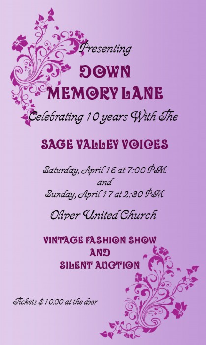 Down memory lane April 11, 2011 Come 45 minutes early to to the concert to bid on our wonderful fundraiser Silent Auction items! Bring loonies and toonies and your chequebook!