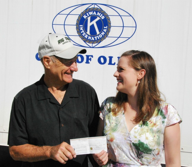 With best wishes for her career as an operatic soprano, Kiwanis Director Bill Dallamore presents Jena Moore with a cheque for $1500 towards the coming year’s tuition expenses.