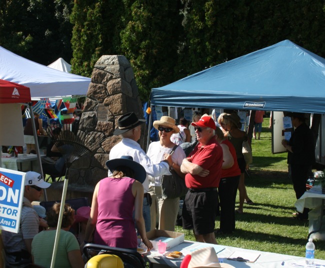 Tom Siddon talks to Vaseux Lake residents Diane and Ron Worth at West Fest in Okanagan Falls Saturday. Siddon, a former federal cabinet minister wants to replace the retiring Bill Schwarz on the Regional District Board. Election is November 19th.