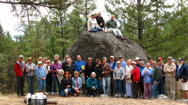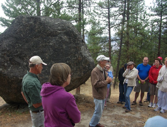 At the rock, geologist, Murray Roed, gave a talk on the geology of the rock, and his theory on how it came to be there. He stated that it would have been carried from somewhere north of its present location by a glacier during the ice age and deposited there when the ice melted. Murray, further talked about the geology of the south Okanagan with topics such as McIntyre Bluff and the formation of various features in the area, after the talk, he took questions from the folks present. Refreshments followed the talk.