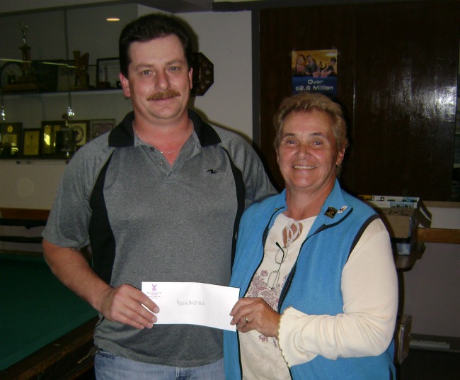 Elks President Joanne Bray of th Lodge # 267 presents a 1,000 dollar cheque to Bernie Michaud the father of Brittany Michaud the 13 year old Oliver girl that is still waiting for a heart transplant.