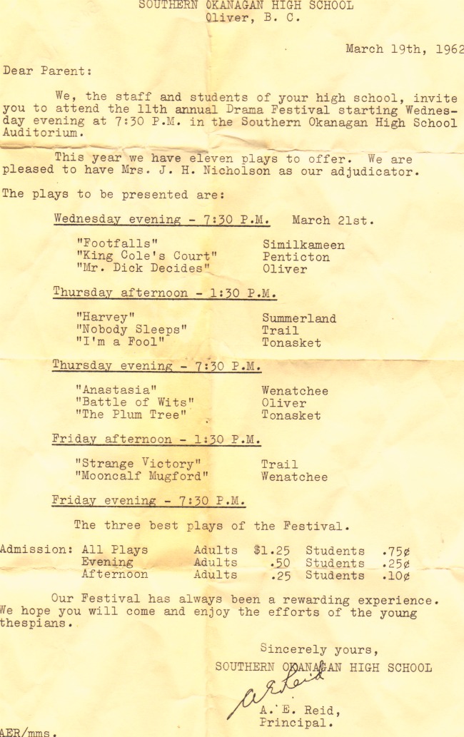 Drama Festival 1962 January 9, 2012 Found at old Ripley House – thanks to Margie Mathieson 50 years ago – note who typed letter