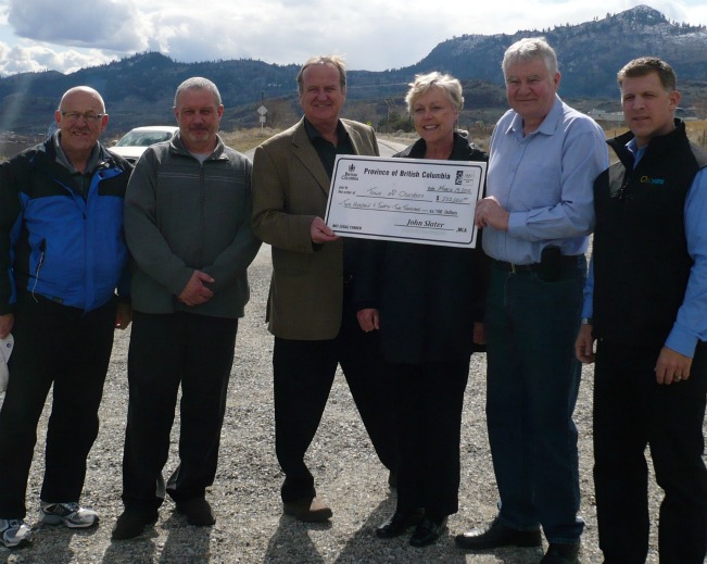 The Town of Osoyoos will receive $232,000 from the Ministry of Community, Sport, and Cultural Development’s Community Recreation Program to help fund a project to construct a public walkway along Pebble Beach Drive (from Golf Course Road to 115th Street) and along 115th Street (from Pebble Beach Drive to 62nd Avenue). Slater shown with Osoyoos Town Council – Ted standing in for Michael Ryan.