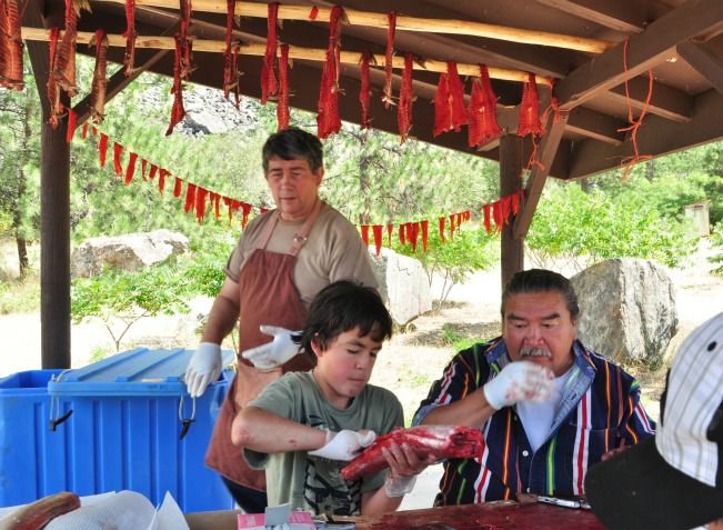“The photos were taken by myself, Ruby Alexis during a salmon camp at Gallagher Lake which was hosted by the Okanagan Nation Alliance and the En’owkin Centre. The first photo is of Okanagan River sockeye drying on a traditional rack. The second photo is Gary Bonneau and Chris Armstrong showing an Okanagan youth, my son-Raymond Alexis how to clean and prepare the salmon for processing. Several processing methods are being used at the camp, including drying, smoking and canning salmon. As a special note, some of the sockeye salmon being processed at the camp was harvested at Okanagan Falls, which was one of the most significant Okanagan-Syilx fisheries on this side of the international boundary.”