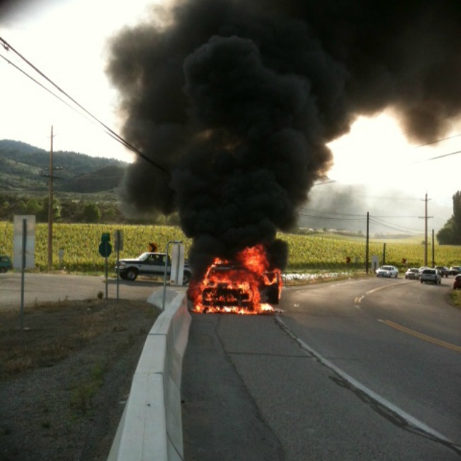 RCMP report that a 71 year old female driver noted her car was overheating with smoke coming from the engine compartment of her Jeep Cherokee. She pulled over to the side of the road and the Jeep started on fire. Osoyoos FD attended to put out the fire and officers assisted with traffic control.