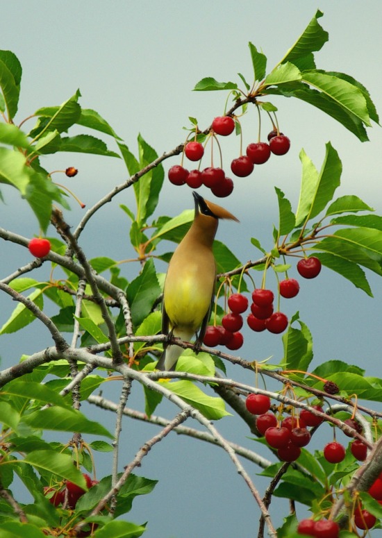 Waxwing on a cherry tree July 3, 2012 Once again, Lorraine spotted it, “quick,’ she said “Waxwings are on our cherry tree” So I grabbed my camera, put on the 300mm lens and got this shot. Photo by Ed Dukes