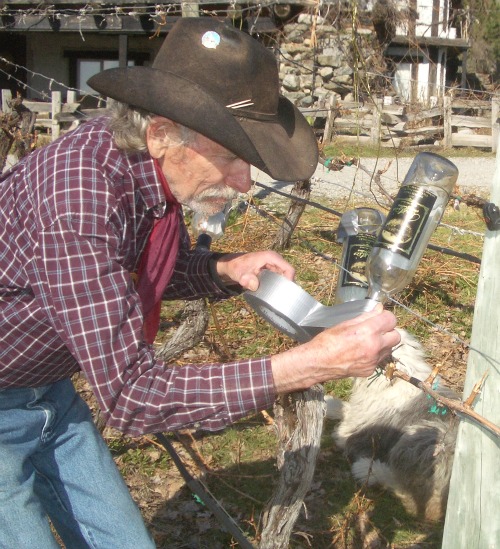 Grape Wrangler Kenny McRae carefully attaching bottles to soon to be sprouting