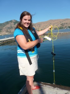 Summer student, Heather Munts, deploying a substrate monitor into Okanagan Lake