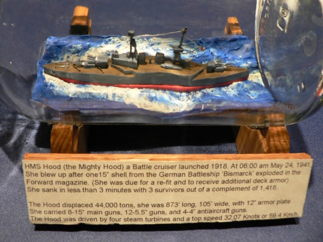Here is HMS Hood in a slightly distorted bottle. The masts had to be put in place with tweezers after the hull was past the neck of the bottle and as luck would have it the rear mast leans back too much and now it is glued in place. I live and learn!