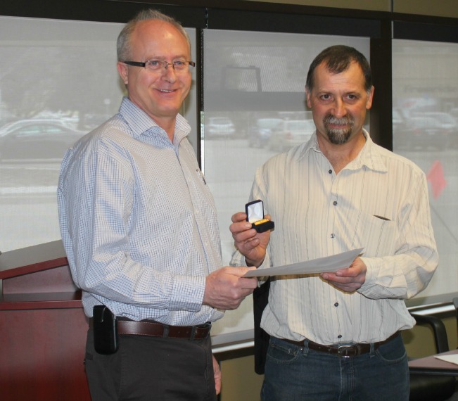 Award presented to Dale Kronebusch (left) of the RDOS staff by Regional District Chair Mark Pendergraft Thursday in Penticton on behalf of the BC Government and the office of the Fire Commissioner.