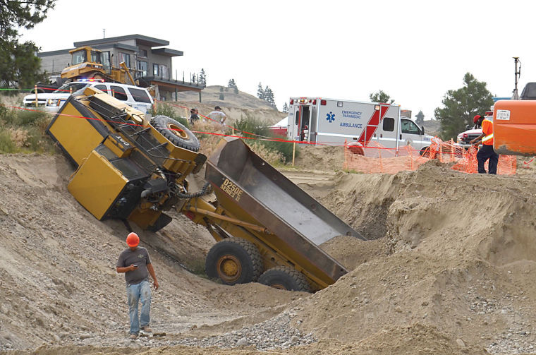 Police and ambulance called to the Skaha Hills development in Penticton Monday afternoon after an embankment gave way, causing an earth hauler to overturn