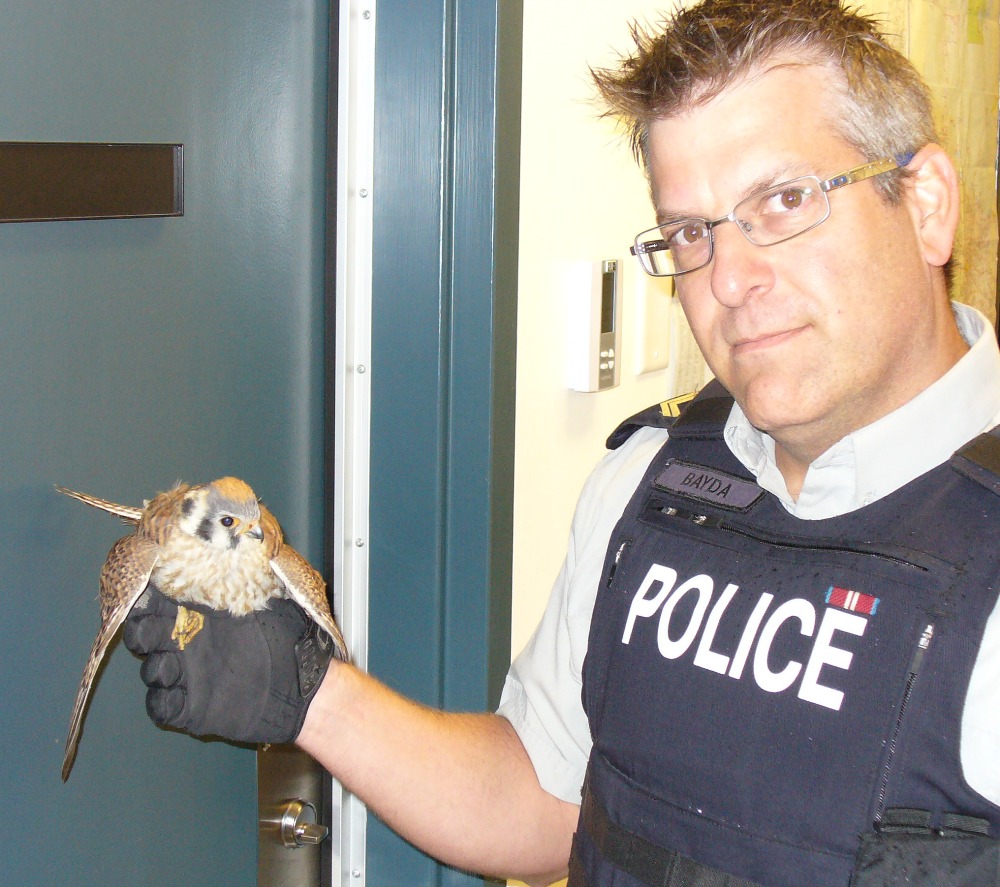 On April 24, 2015 a commercial truck driver travelling between Rock Creek and Osoyoos had a Kestrel Hawk fly into his path and become lodged in the grille of his semi truck. The driver was unable to remove the hawk on his own yet wanted to ensure the hawk received help. The driver stopped at the Osoyoos RCMP Detachment and with the assistance of Cpl. Jason Bayda (pictured), the two were able to free the hawk from the grille.