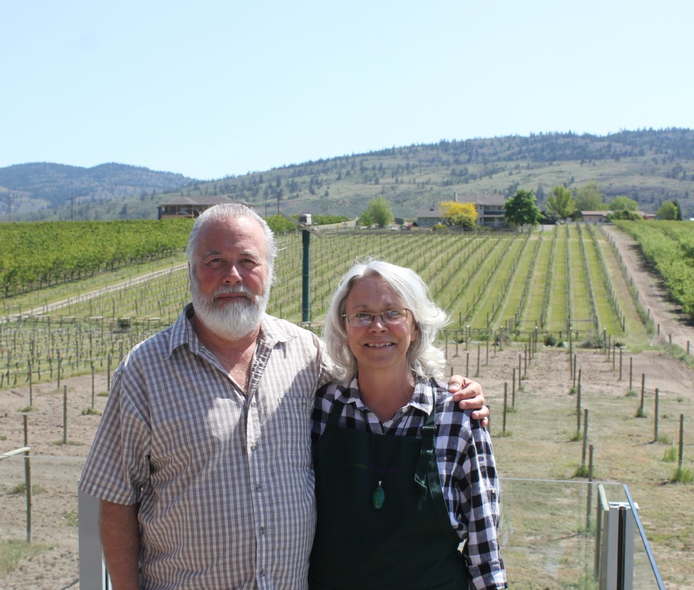 Below owners Ray and Wendy COULOMBE on a glassed patio at the rear of the tasting room overlooking their home and vineyard
