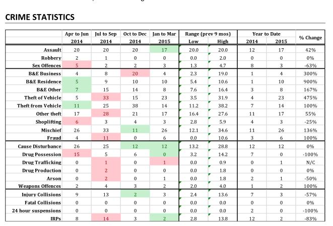 This reporting period encompasses the first three-month period of the calendar year 2015. The intent of this correspondence is to provide Mayor and Council with a brief overview of policing operations as they pertain to the Town of Oliver.