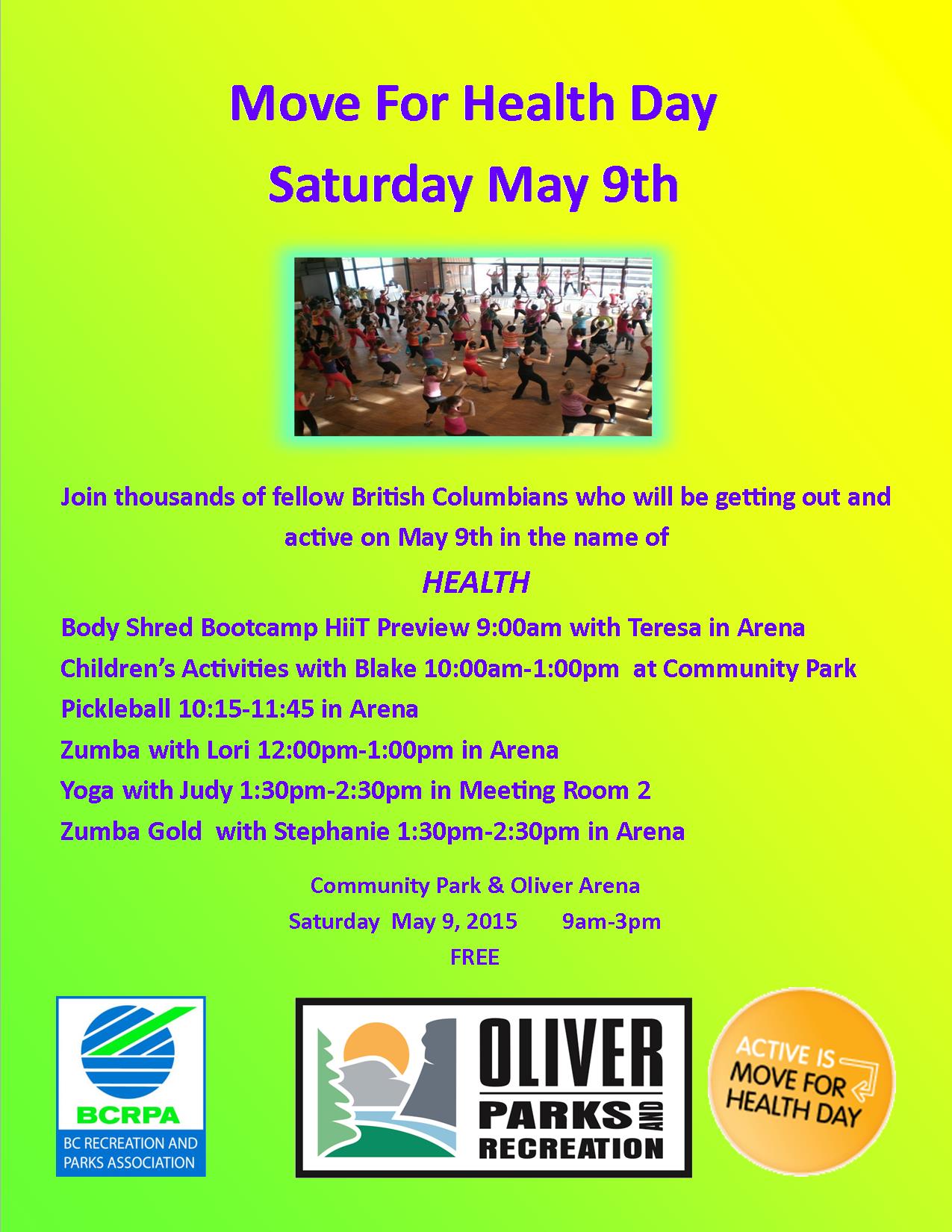 Participants from Oliver will join millions of people from all over the world to celebrate International Move for Health Day on or around May 10, 2015. In Oliver we will be hosting our Move for Health Day on Saturday May 9 from 9am-3pm at the Oliver Community Centre and Arena. This will be a great chance to come out and try some of our fitness programs and activities.