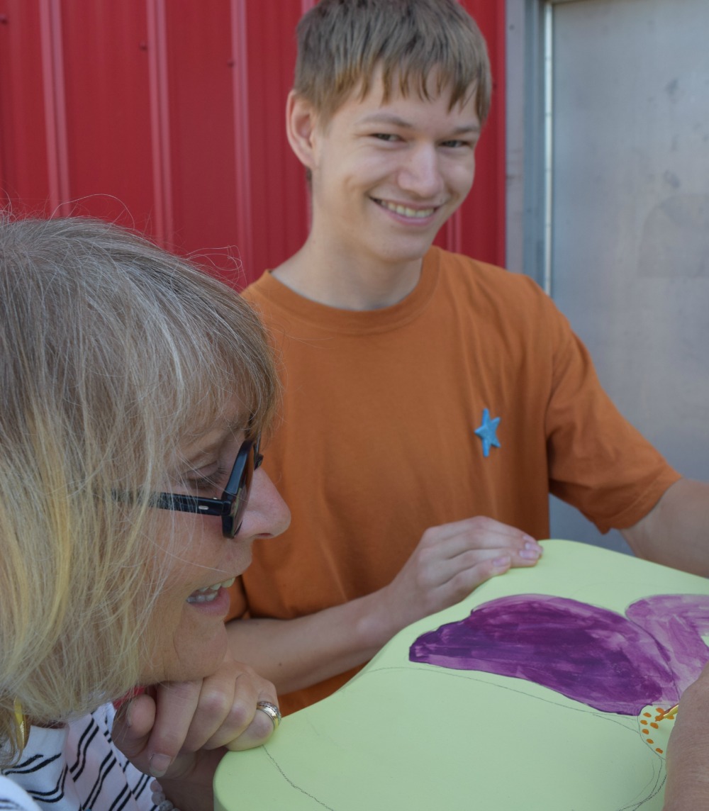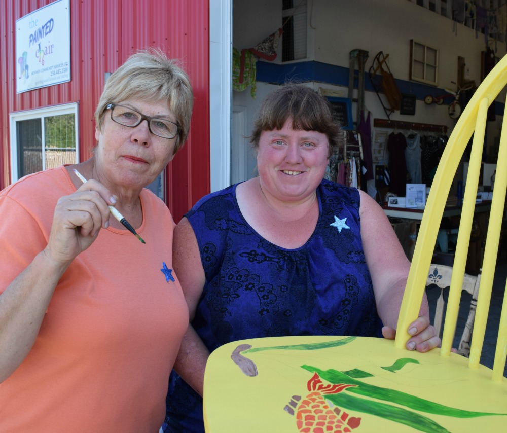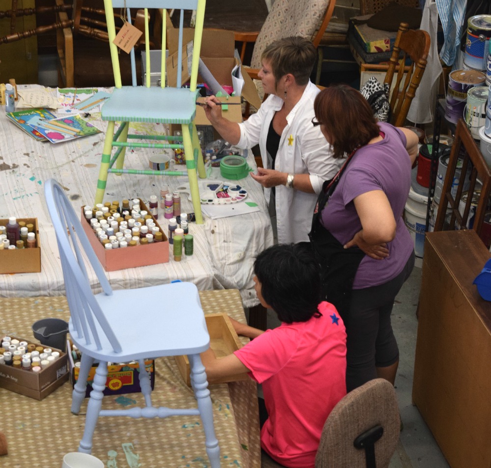 painted May 20, 2015 Bobbi with Artist Marion Trimble at Painted Chair Below Diane Gane shows how it is done Bottom Leza Macdonald helping budding artist with is his chair.