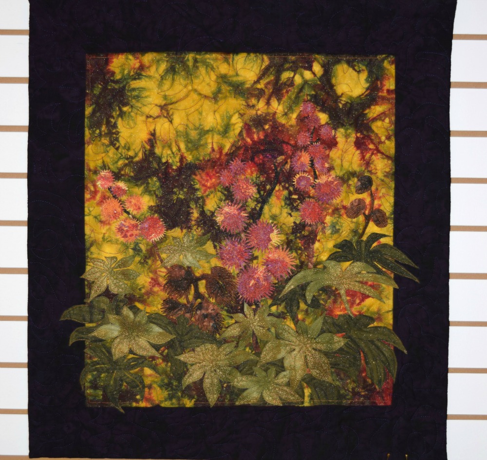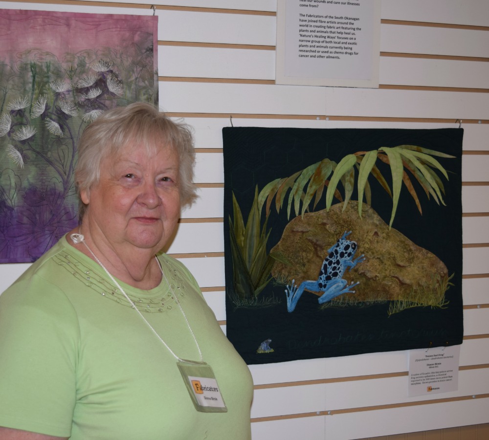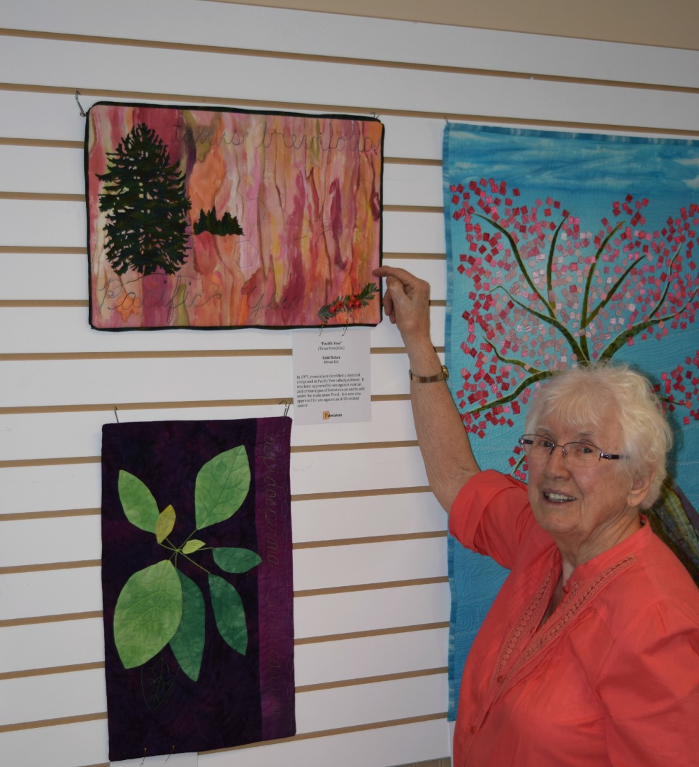 Display of quilts at SOICS on Main May 29, 2015 Diane Birnie – blue frog Enid Baker looks to her quilt