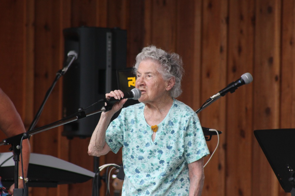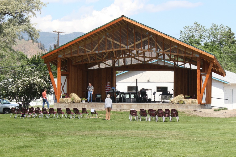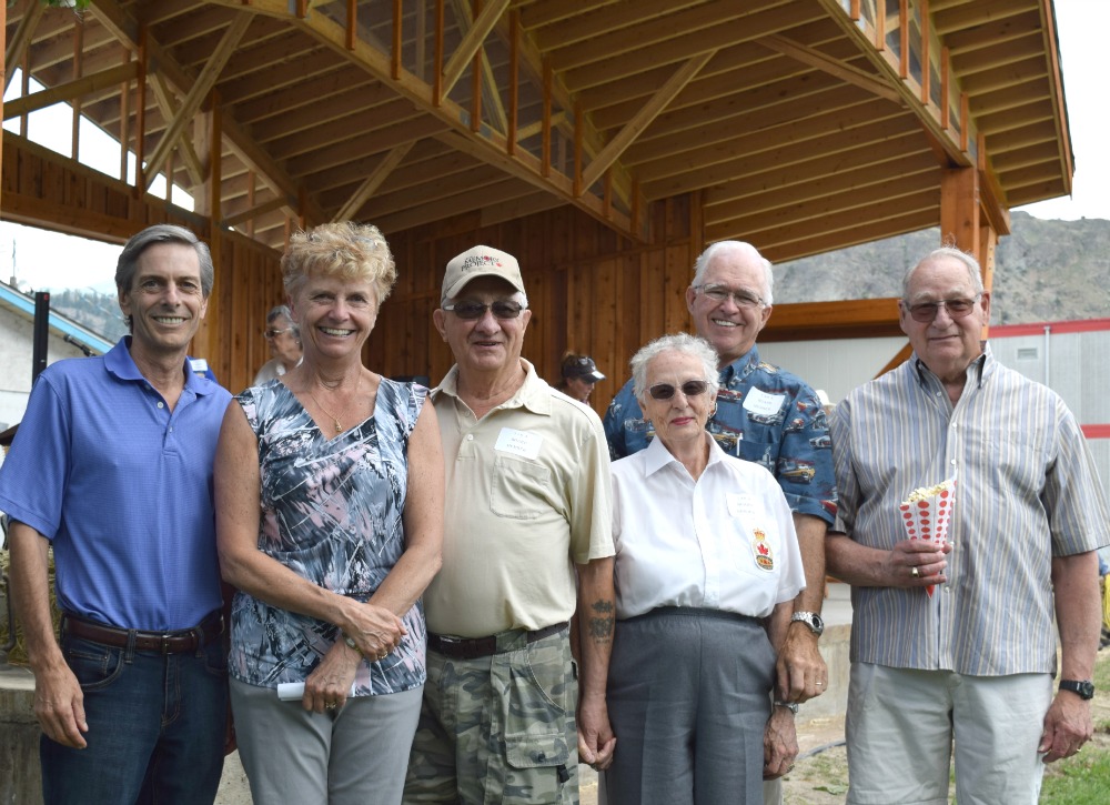 Bandshell opens in OK Falls May 30, 2015 98 year old Mary Ferris* steals the show – she arrived at 18 in Okanagan Falls a few years ago. VIPs line up for the picture