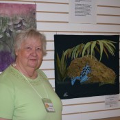 Diane Birnie – blue frog Enid Baker looks to her quilt