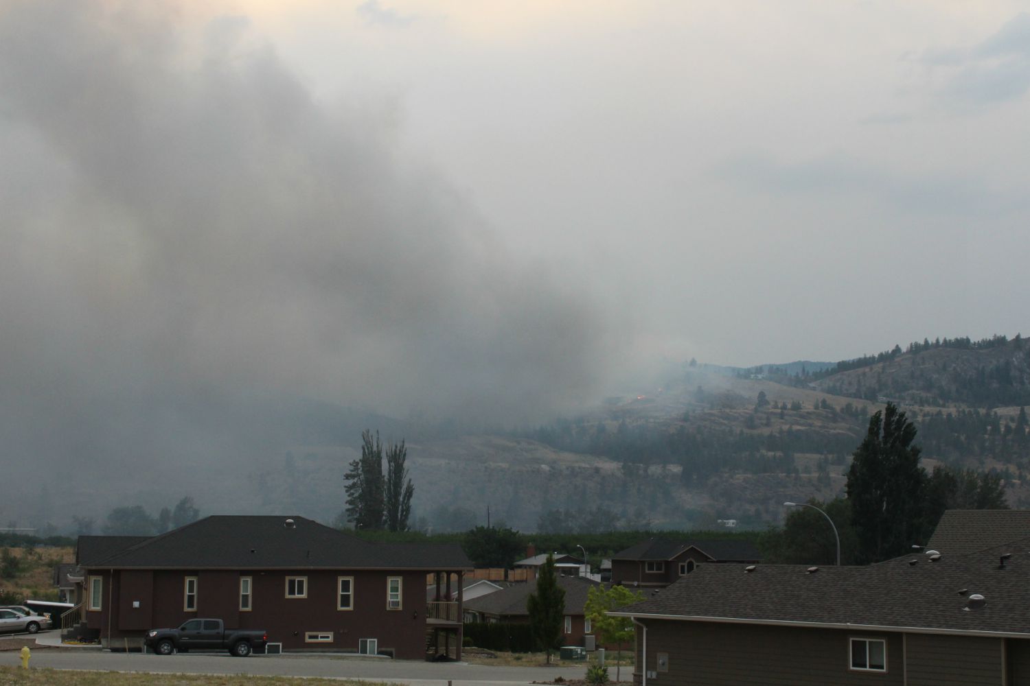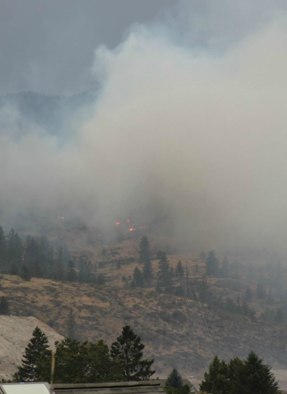 Wilson-Patten Rd fire August 14, 2015 Reports indicate everyone taken out of the area so helicopters can attack the fire. All photos taken from Mountainview Drive in Oliver – across the valley floor Visibility now limited to a couple hundred feet.