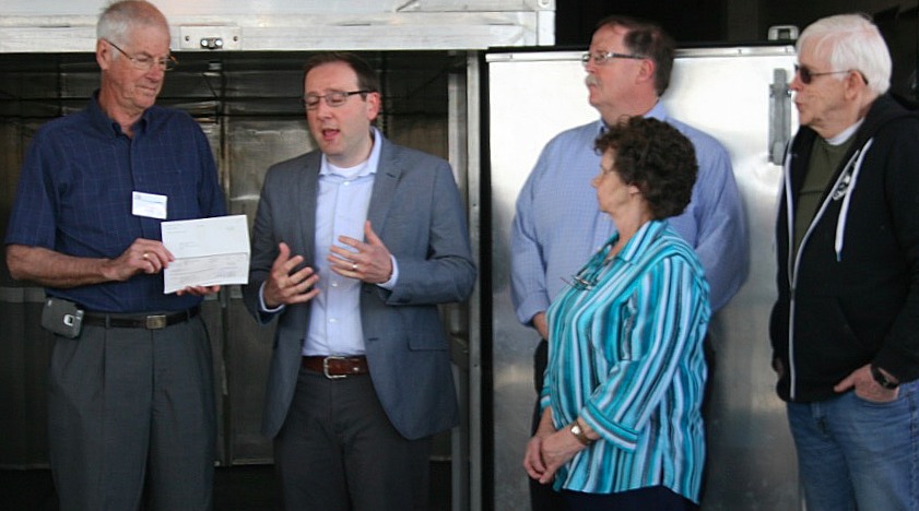Dr. Jordan Noftle with Society members – a cheque presentation of $19, 158.85 Saturday from the Church of Jesus Christ of Latter-day Saints.
