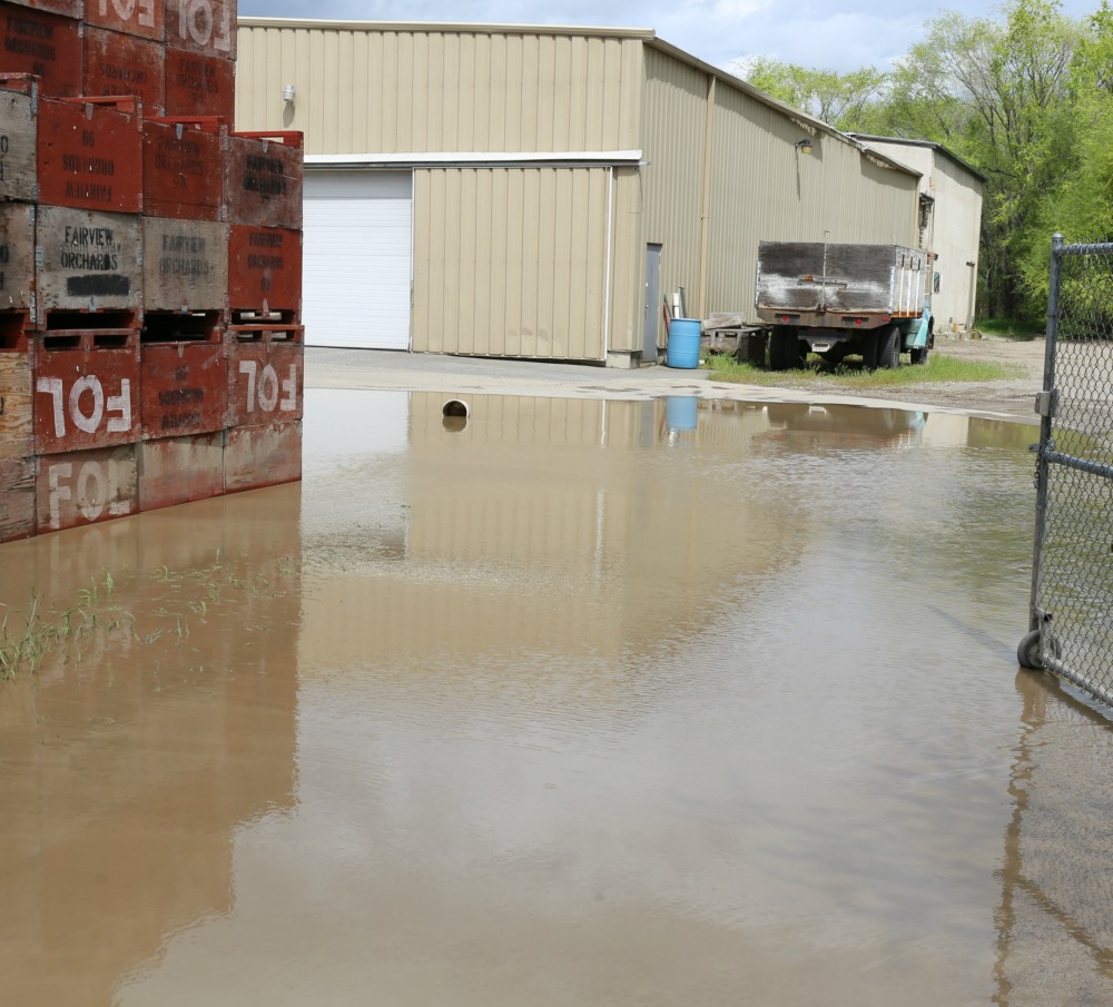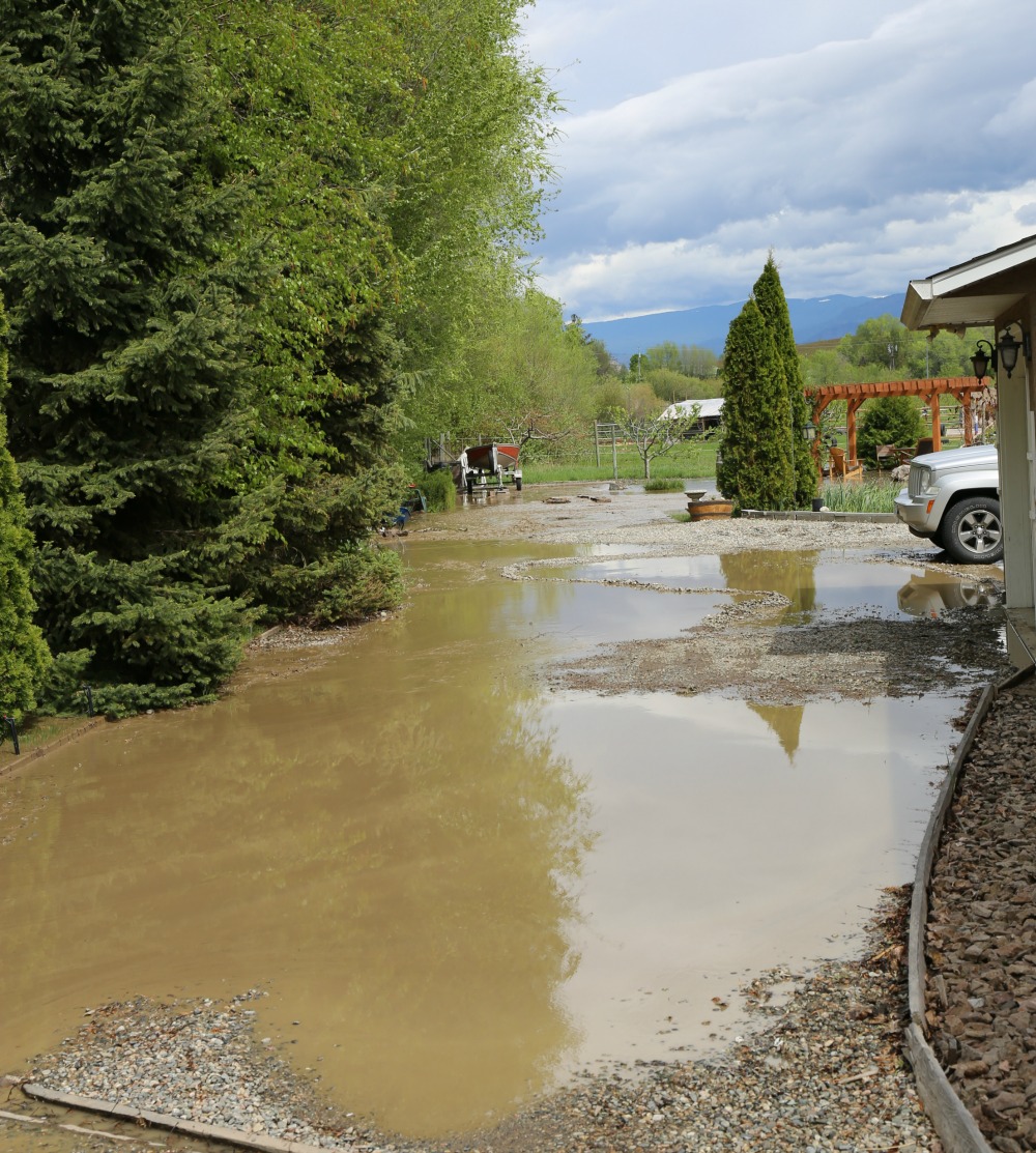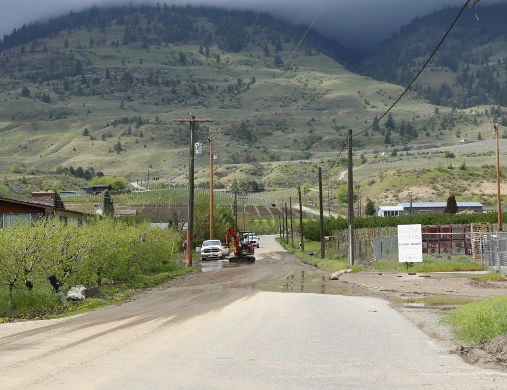 Tinhorn Creek springs a leak onto Rd 9 May 5, 2017 Observation time: 12 noon Some sandbagging going on Some roadwork clearging sand and dirt River is high at Rd 9 bridge Testalinda Creek is bring a lot of dirt down but levels not threatening. More pictures later.