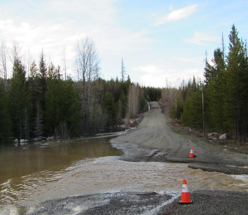 Warm temperatures and Thursday’s storm accelerated the snow melt at Baldy. Emcon crews were working today trying to preserve the road bed 31 kms east of Oliver on McKinney Road. There is also a “lake” on the Baldy road near Camp McKinney. The roads are passable, but there continues to be a heavy run off crossing the roads.