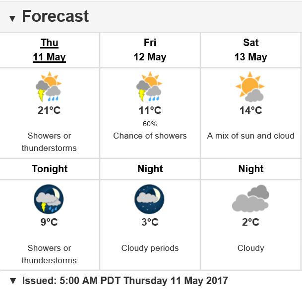 Thunder and Lightning alert May 11, 2017 Severe Thunderstorm Watch – nterior British Columbia Conditions are favourable for the development of severe thunderstorms that may be capable of producing strong wind gusts, large hail and heavy rain …