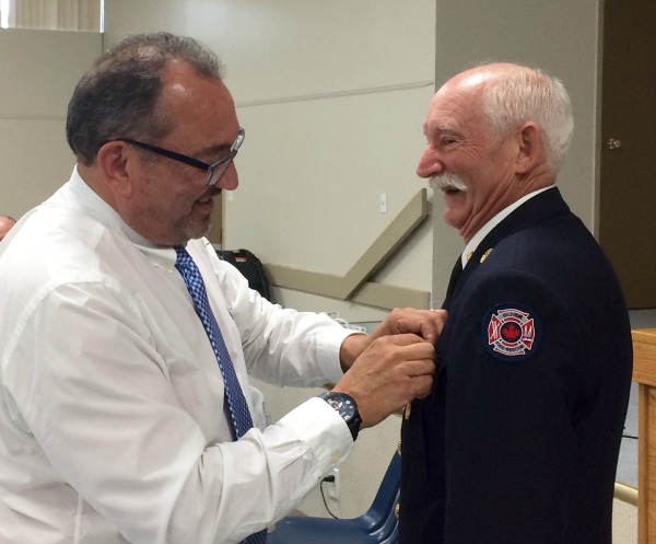Mayor Ron Hovanes pins a provincial long-service medal on the proud chest of town fire chief Bob Graham.