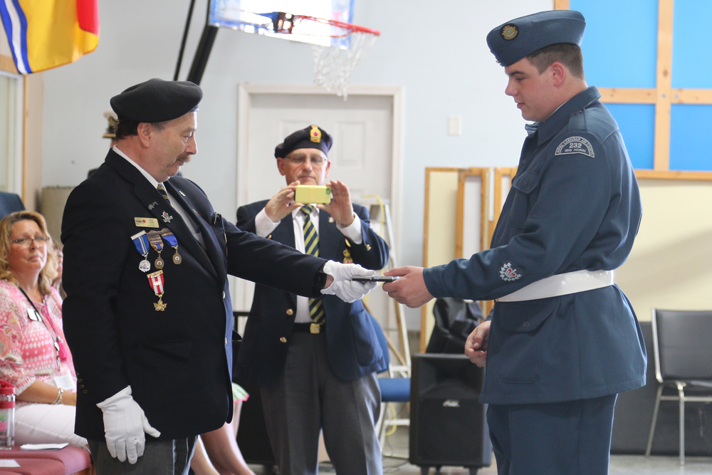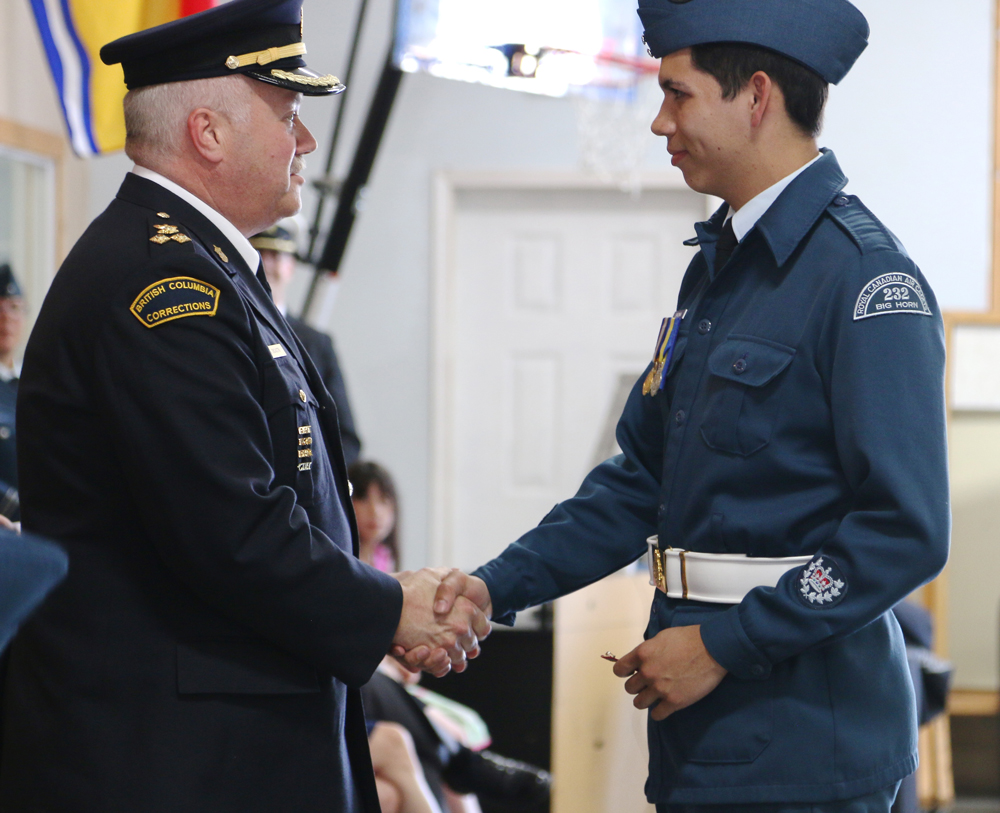Squadron Commander WO Ryan Encina, the winner of the Spirit of Oliver Youth Award today, is congratulated by Reviewing Officer Warden Steve DiCastri for receiving the Lord Strathcona Medal, the highest award bestowed on a cadet in recognition of exemplary performance in physical and military training.