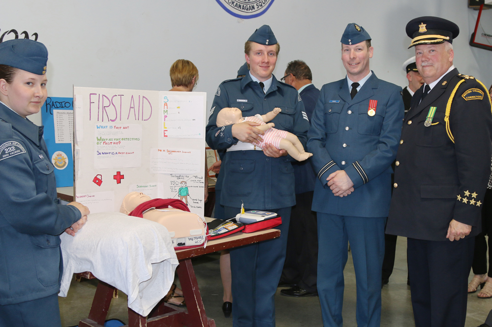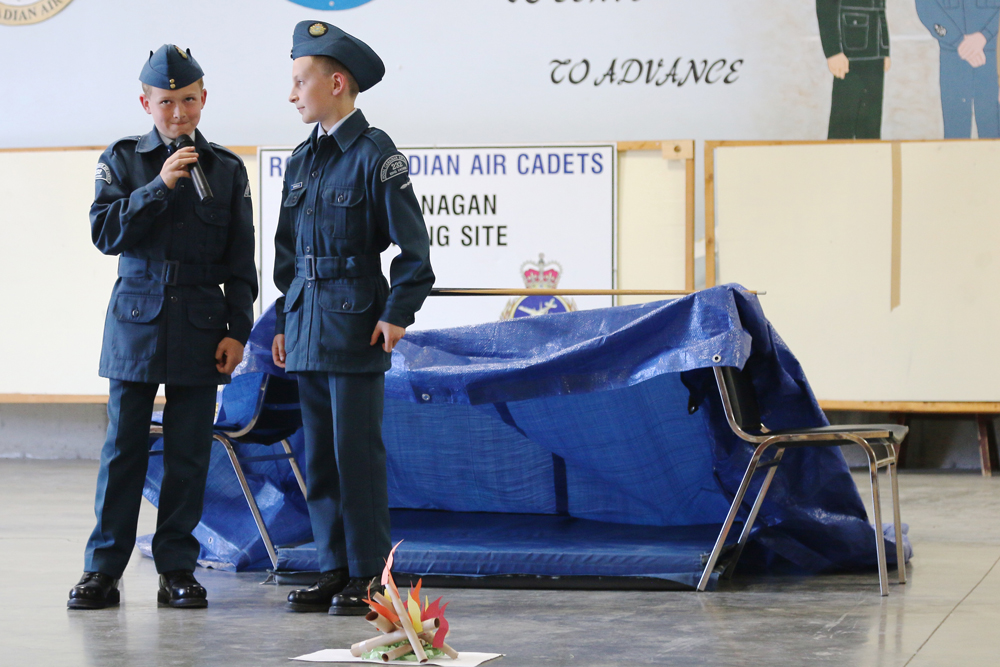 At attention for inspection the Cadets look there finest, after the Cadets gave demonstrations in survival, how to purify water, first aid and seen in this photo, Lead Air Cadet Jeremy Tite and Lead Air Cadet Thomas Iannella tell us how to build a fire.
