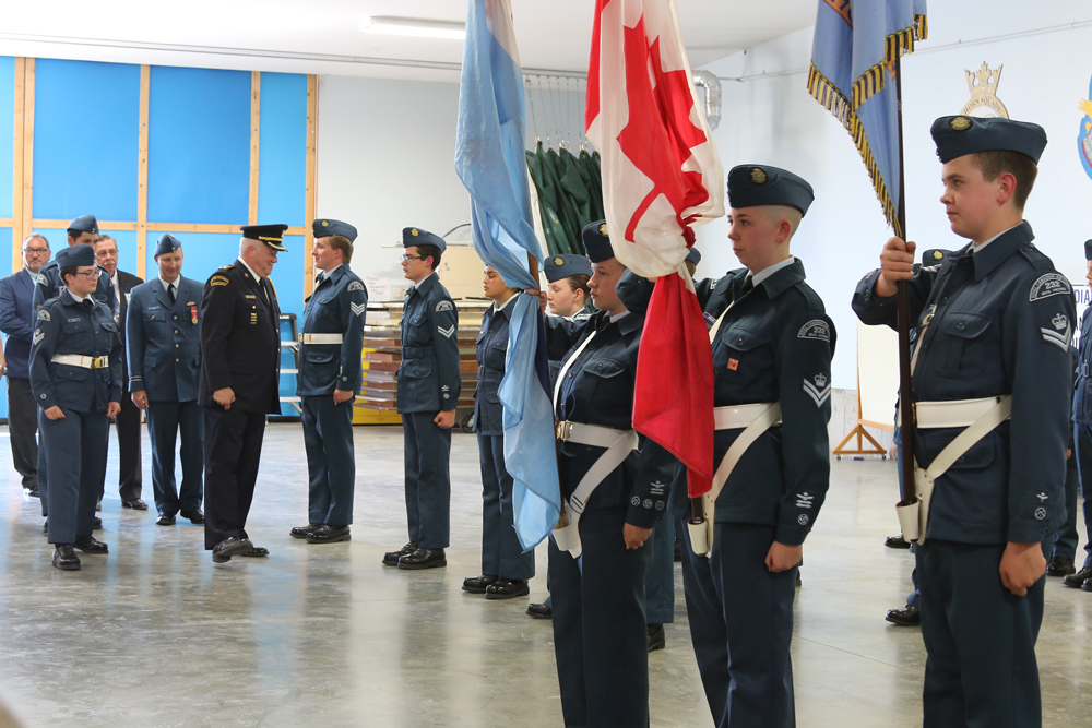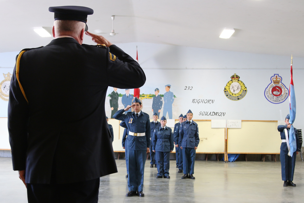 232 Bighorn Squadron Commander WO Ryan Encina salutes Reviewing Officer Warden Steve DiCastri at the 74th Annual Ceremonial Parade and Awards Ceremony held at the Cadet Hanger.