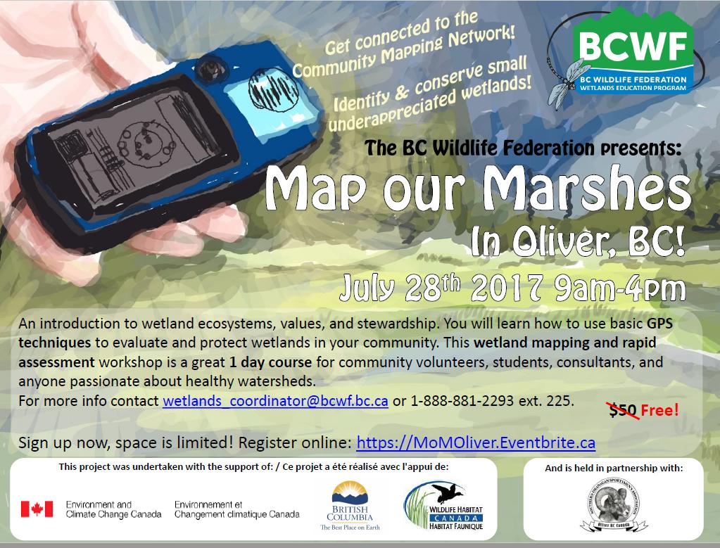 BC Wildlife Federation’s Map our Marshes course offers passionate community members the technical and field skills for mapping smaller, unappreciated wetlands with GPS (Global Positioning System) receivers as well as how to upload these maps to an online database – the Community Mapping Network. Smaller wetlands are highly productive for a diversity of species as well as flood control and water filtration capacities. Development and threats to wetlands across BC signify the importance of mapping small wetlands and securing the information online. As users of the environment, we need to know what ecosystems are in our backyards to help determine conservation mandates as development continues at a rapid increase.