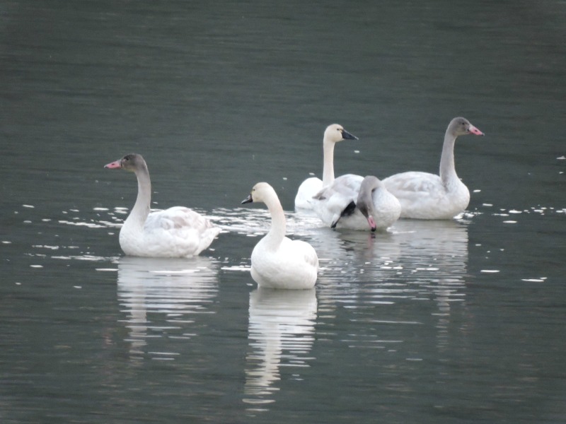 *Adult Trumpeter Swans Cygnus buccinator are large birds with white feathers and black legs and feet. The feathers of the head and the upper part of the neck often become stained orange as a result of feeding in areas rich in iron salts. The lack of colour anywhere on the swans’ bodies distinguishes them from other white species of waterfowl, such as snow geese, which have black wing tips. The male swan, or cob, weighs an average of 12 kg. The female, or pen, is slightly smaller, averaging 10 kg. Wings may span 3 m.