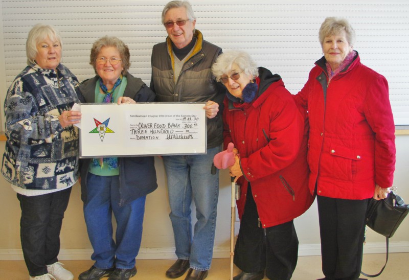 The members of the Order of the Eastern Star recently held a soup and bunwich fundraiser at the Elks Hall, 50% of the profits going to the Oliver Food Bank. Here, presenting a cheque for $300 to Yolande, at the food bank are Alice Mathews, Ken Robinson, Trudy Weiler and Kathy Farrell.