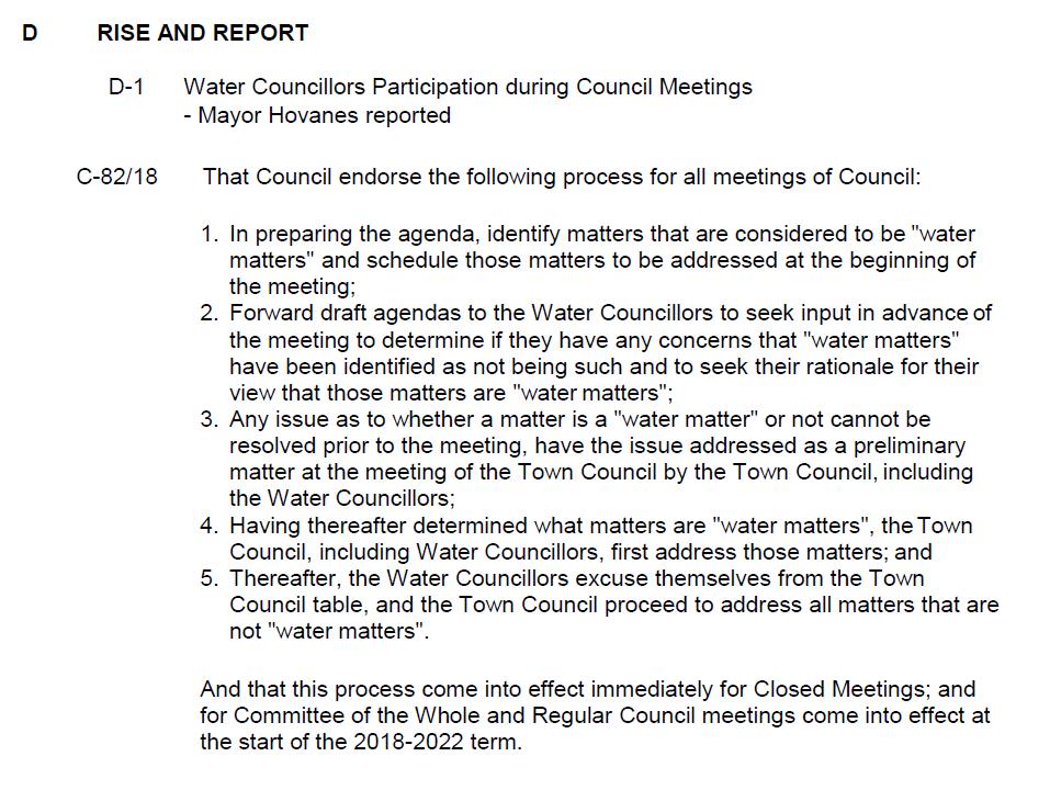 At the March 11th closed meeting, Council resolved to release the legal opinion regarding the Role of Water Councillors at the Council table. After further discussion, Council will now allow Water Councillors to attend open meetings with the jurisdiction to participate in water matters only and remain at the table. Water Councillors will also be extended an invitation to participate in agenda review to determine what is and what is not a water matter.