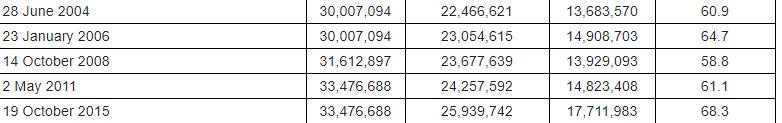 A table on turnout. In the 60’s the average turnout about 75% with one near 80 percent. Turnout has fallen off with the lowest in recent memory on this card – population, electors on a list, those that voted and percent turnout.