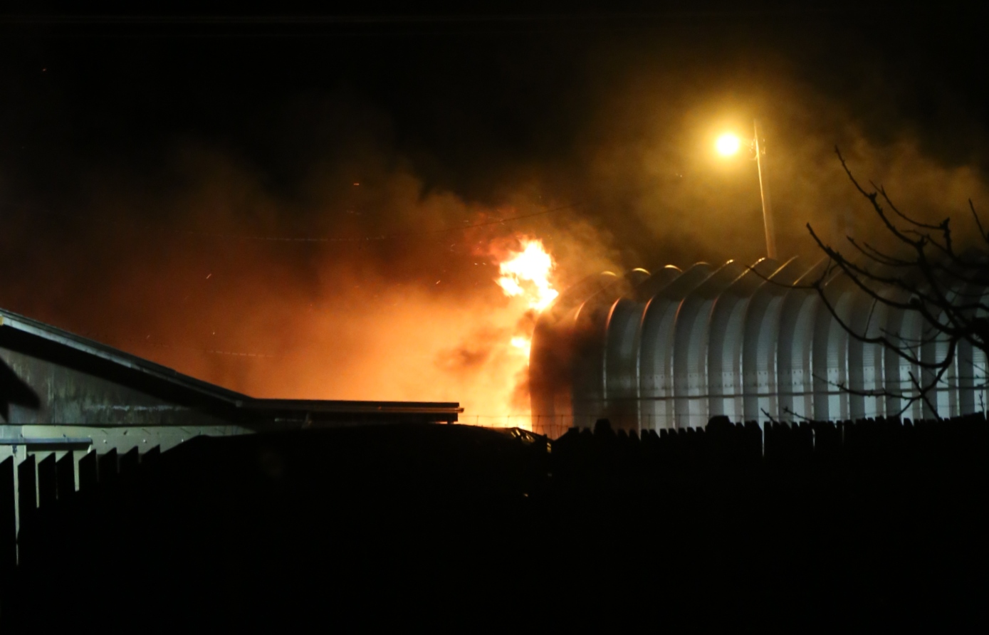 Quonset Hut on fire to the west of main auto body office and shops. No injuries reported. Extent of damage not determined