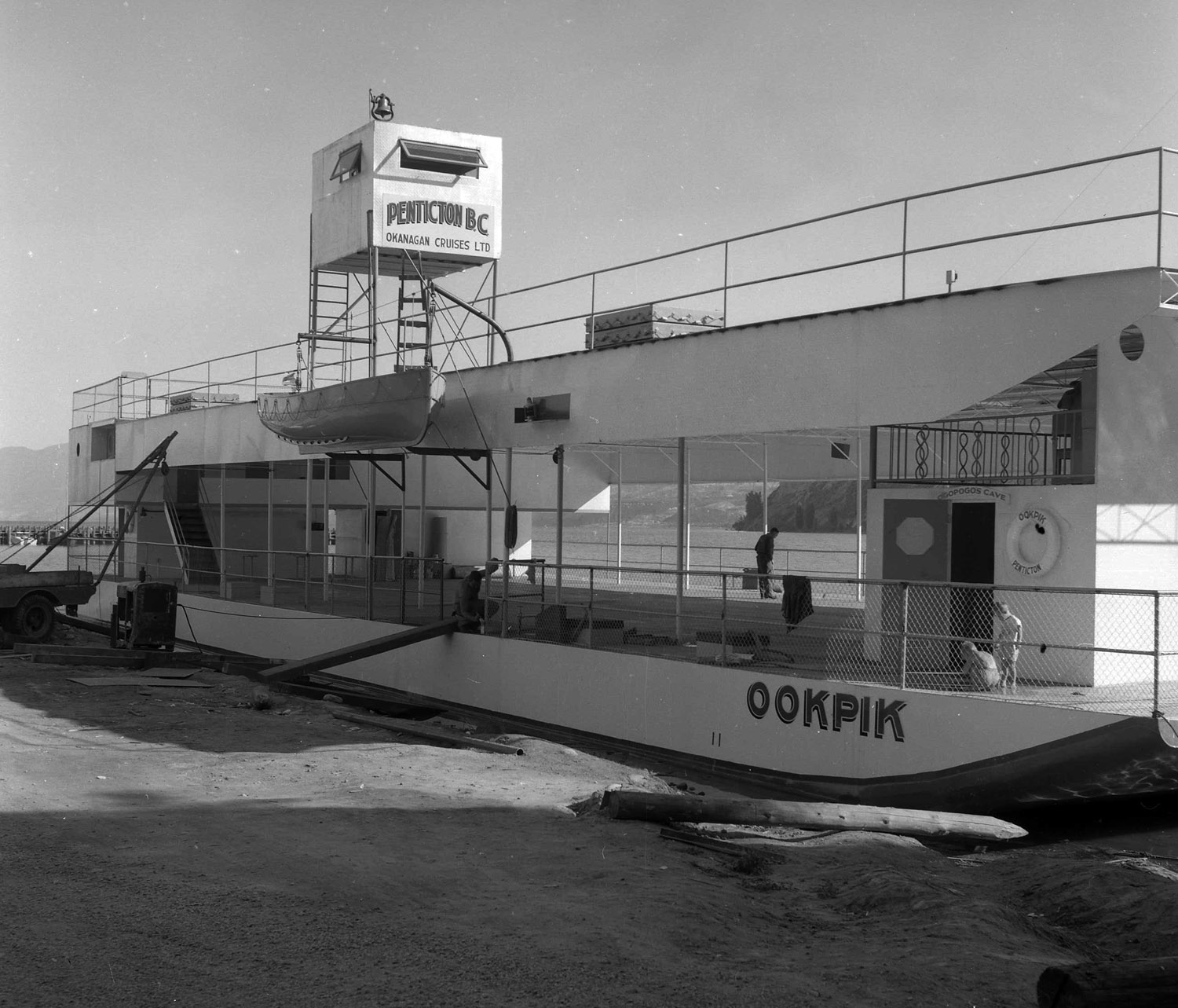Ookpik had a dance floor and stage on the main deck and a 1000 square foot observation deck above, featuring live entertainment; at least that was the plan. An ad in the Penticton Herald of June 30, 1964 (page 15) stated Ookpik was to make daily four-hour cruises at eight knots, but never made its maiden voyage in 1964. Laid up for the winter, she was beached in a storm just before Christmas. Vandals then re-christened it “Toothpik.”