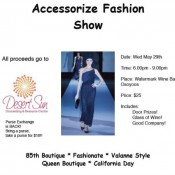 Event Info Accessorize Fashion Show Wednesday May 29th Watermark Wine Bar Osoyoos 6 to 9 pm $25 Tickets at Beyond Bliss in Oliver and Imperial Office-Pro, Jo’s Osoyoos as well Proceeds to Desert Sun