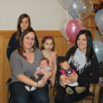 Two young wives of firemen celebrate with family and friends at the Oliver Fire Hall lounge Saturday. Seated left: Erin Hayes and baby Marshall Lucas Tribbick with daughter Ella (behind). Seated right: Becky Skaros and baby Hayley Karoline Dezall. Becky’s sister Justice stands in the middle. Fathers Spencer Tribbick and Roger Dezall