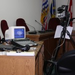 1. Channel 18 sets up live TV debate in Oliver Town Council chambers. 2. Moderator Petra Veintimilla, President of SO Chamber of Commerce. 3. Challenging candidates Shan Lavell/Liberal Party, Bryan Hunt/Green Party and Stephen Hill/Conservative Party. 4. MP Alex Atamamenko speaks with Chamber Manager Bonnie Dancey as debate is about to start Wednesday.